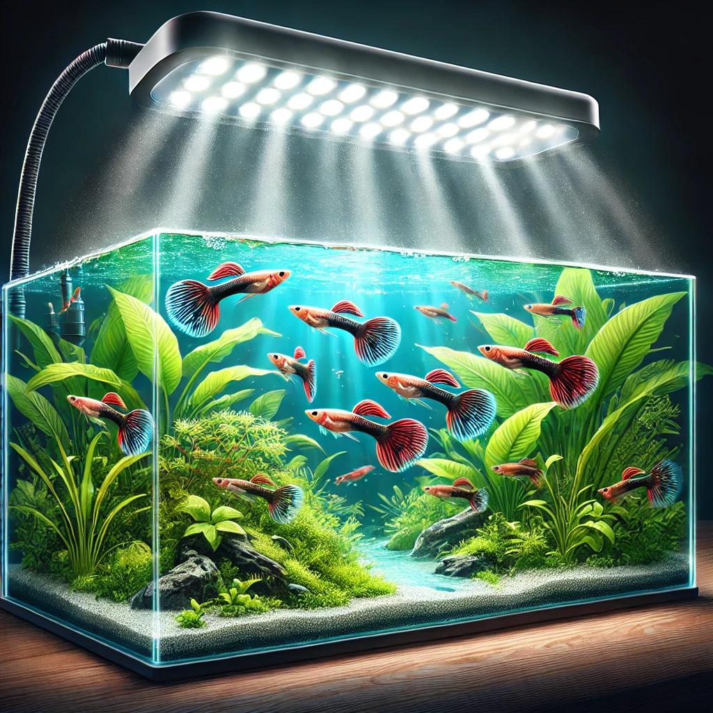 어항 조명은 구피의 색상을 더 돋보이게 해줄 뿐만 아니라 수초의 성장에도 도움을 줘요. 타이머 기능이 있는 LED 조명을 사용하면 일정한 주기로 빛을 제공할 수 있어 편리합니다.
