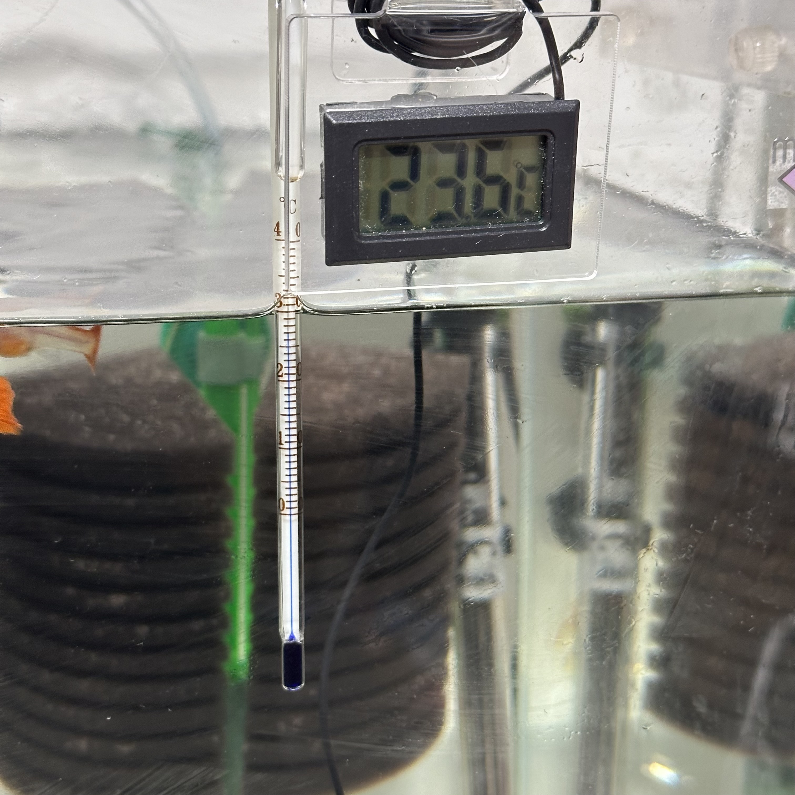 어항 밖에서 전자 온도계는 켈란 온도계와 같이 27도였으나 어항속에 넣자 23.6도로 표시가 되었다. 결국 나는 모두 다 저 파란 온도계로 바꿨으며, 현재까지 가장 정확하고 안전하다. 어항에 떨어뜨려 깨진적이 있으나 바로 잉크를 빼내기도 했으나 물고기들이 타격을 입지 않았기에 공유한다. 전자온도계는 미관상 예쁘다.